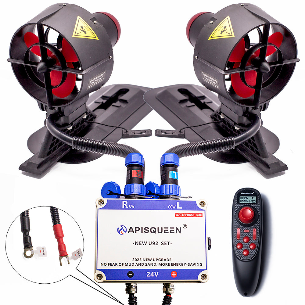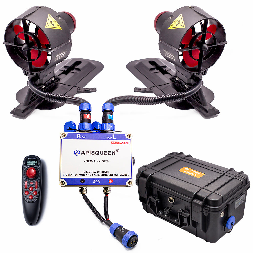 APISQUEEN: Zwei U92 Pro Unterwasserstrahlruder mit Fernbedienung und Akku. Der Außenrotormotor ist in einem Schutzgehäuse untergebracht und somit gegen Sand und Schlamm geschützt. Geeignet für Kajaks, Schlauchboote und Paddle-Boards.