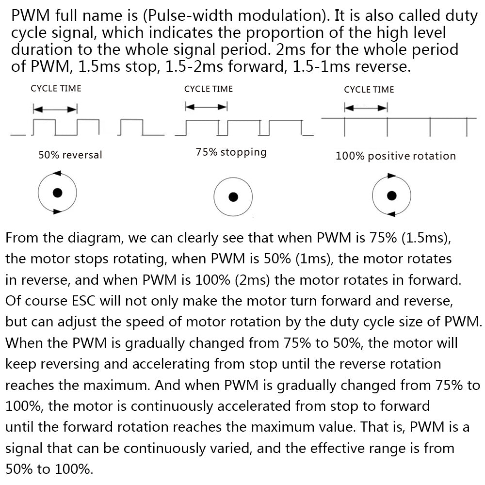 PWM full name is (Pulse-width modulation). It is also called duty cycle signal, which indicates the proportion of the high level duration to the whole signal period. 2ms for the whole period of PWM, 1.5ms stop, 1.5-2ms forward, 1.5-1ms reverse.